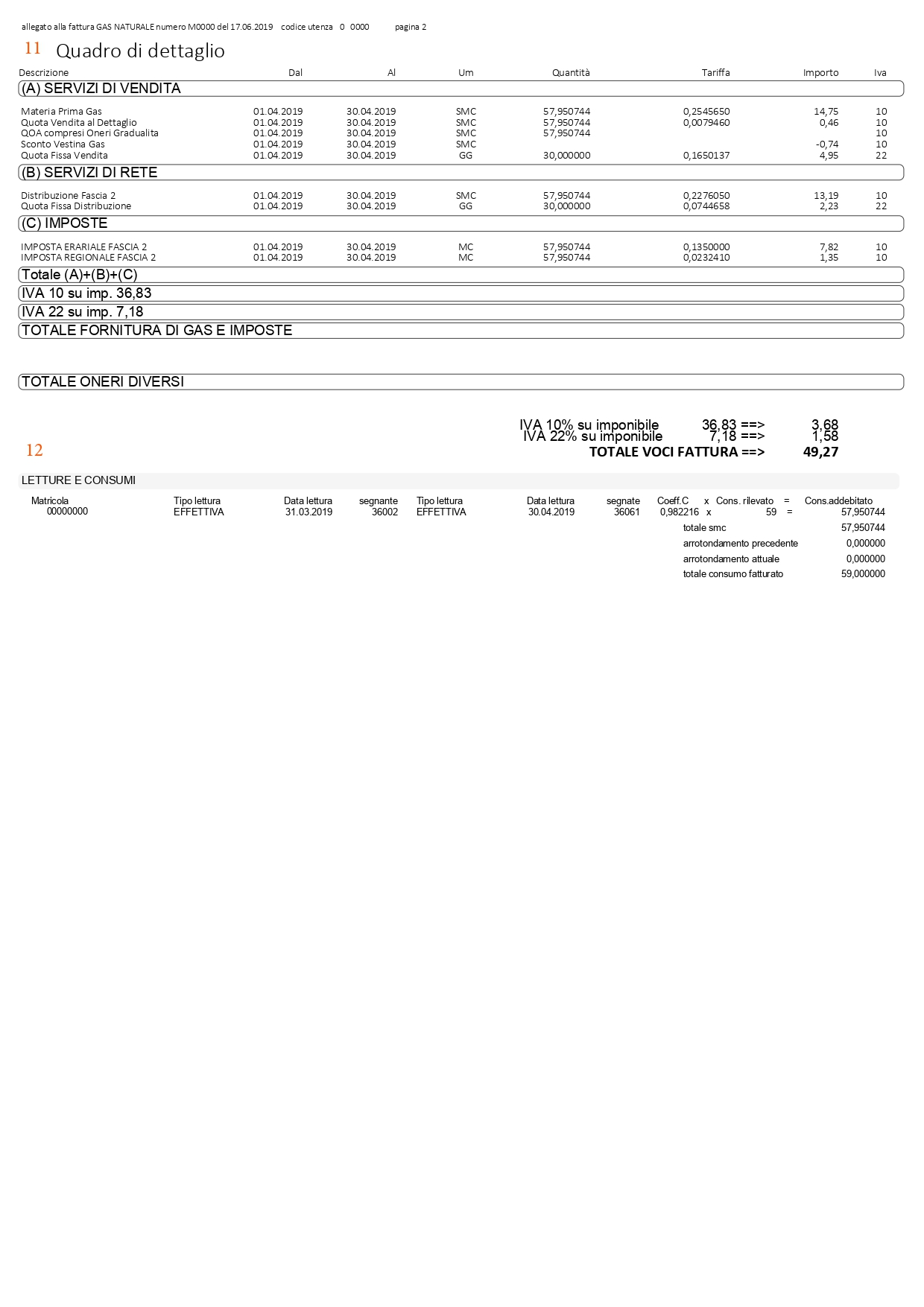 • Dettaglio: nel quale sono indicati tutti i consumi generati, le letture dei contatori e le imposte